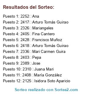 Lista de participantes: 2417 Arturo Tomás Guirao , 2252 Ana , 2125 Isidora Soto Aparicio , 2428 Francisco Muñoz , 2408 María González , 2326 Mariangeles , 2403 Pepa , 2418 Arturo Tomás Guirao , 2389 Jose , 2336 Mari Carmen Guira , 2310 Juana Mari , 2405 Fina Cantero.