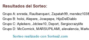 Lista de participantes: Alepere, Zapatah99, MARSUPILAMI, HijoDelDiablo, Jdclew10, Raulbanqueri, Aplekero, Sergiocrazylife, Josepepe, enreda, holoi, mendez1038, McCormick, Markel, Deport, alevalencia.