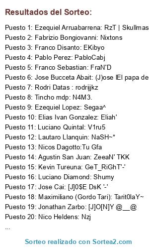 Lista de participantes: Nicos Dagotto:Tu Gfa, Joaquin Goell: Pela2 Darknes, Kevin Tureuna: GeT_RiGhT'-', Ezequiel Lopez: Segaa^, Lautaro Llanquin: NaSH~*, Tincho mdp: N4M3., Seba Valez: NOgi, Maximiliano (Gordo Tari): Tarit0laY~, Nico Heldens: Nzj, Aitor Sebastian Segura: Amarok 2.0 TDi, Jose Bucceta Abait: (J)ose lEl papa de los Heladosl, Agustin San Juan: ZeeaN' TKK, Fran Correa: MaTaTaB1', Dario Vergara: DracoS, Rodri Moreno: Masajjxks, Jose Cai: [J]0$E DsK '-', Agustin Sevilla: sevkey10, Lauti Ortiz: TwD OuuTlaas *:-, Luciano Quintal: V1ru5, Juan Lizzo: Heisenberg ', Rodri Datas : rodrijjkz, Gaby Rc Firpo: ;ZekO -., Luciano Diamond: Shumy, Fabrizio Bongiovanni: Nixtons, Ezequiel Arruabarrena: RzT | Skullmasterlssj2, Elias Ivan Gonzalez: Eliah', Carli Mendez: CARLI.-, Lucas Aguirre: tsunami, Jonathan Zarbo: [J]O[N]Y @__@, Franco Disanto: EKibyo, Pablo Perez: PabloCabj, Franco Sebastian: FraN'D.