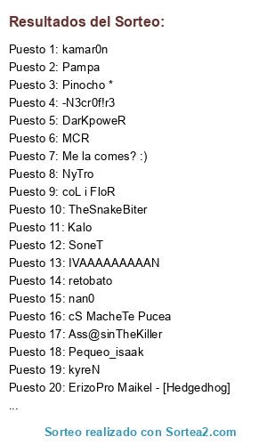 Lista de participantes: DarKpoweR, SoneT, BaSii, kamar0n, kyreN, -N3cr0f!r3, Sakon, TheSnakeBiter, retobato, Kalo, Pinocho *, nan0, MCR, cS MacheTe Pucea, ErizoPro Maikel - [Hedgedhog], Pequeo_isaak, coL i FloR, NyTro, IVAAAAAAAAAN, Me la comes? :), Ass@sinTheKiller, Pampa.