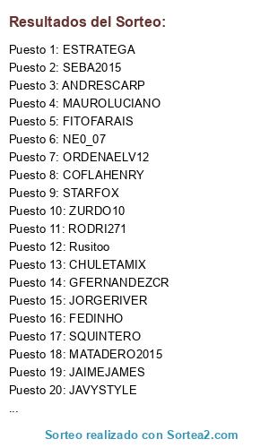 Lista de participantes: Rusitoo, CRISTIAN1877, GFERNANDEZCR, JAVI BARQUI, CRISDU14, RODRIGO2024, SQUINTERO, STARFOX, C3NT4URO, SEBA2015, HARUN, JAVYSTYLE, MATADERO2015, ESTRATEGA, JORGECARTES, COFLAHENRY, JAIMEJAMES, CHULETAMIX, FEDINHO, NICOLAS23, ANDRESCARP, PABLO15, KURILIN, RODRI271, MAUROLUCIANO, FRANCISCO-CABJ, ZURDO10, MATI-GTI, FITOFARAIS, ORDENAELV12, NE0_07, MIG17, AGUS15, KRILIN18, SEBAMAX1918, JORGERIVER.