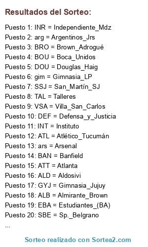 Lista de participantes: arg = Argentinos_Jrs, ars = Arsenal, ALD = Aldosivi, ALB = Almirante_Brown, ATL = Atlético_Tucumán, BAN = Banfield, BOU = Boca_Unidos, BRO = Brown_Adrogué, ATT = Atlanta, DEF = Defensa_y_Justicia, DOU = Douglas_Haig, gim = Gimnasia_LP, GYJ = Gimnasia_Jujuy, INR = Independiente_Mdz, INT = Instituto, EBA = Estudiantes_(BA), SSJ = San_Martín_SJ, SAR = Sarmiento, SBE = Sp._Belgrano, TAL = Talleres, UNI = Unión, VSA = Villa_San_Carlos.
