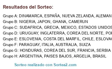 Lista de participantes: ALEMANIA, ARGELIA, ARGENTINA, AUSTRALIA, BRASIL, CAMERUN, CHILE, COREA DEL NORTE, COREA DEL SUR, COSTA DEL MARFIL, DINAMARCA, ESLOVAQUIA, ESLOVENIA, ESPAÑA, ESTADOS UNIDOS, FRANCIA, GHANA, GRECIA, HONDURAS, INGLATERRA, ITALIA, JAPON, MEXICO, NIGERIA, NUEVA ZELANDA, PAISES BAJOS, PARAGUAY, PORTUGAL, SERBIA, SUDAFRICA, SUIZA, URUGUAY.