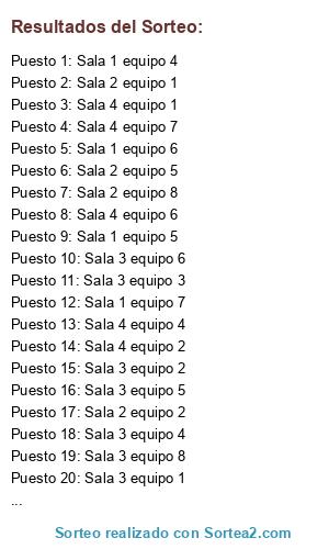 Lista de participantes: Sala 1 equipo 1, Sala 1 equipo 2, Sala 1 equipo 3, Sala 1 equipo 4, Sala 1 equipo 5, Sala 1 equipo 6, Sala 1 equipo 7, Sala 1 equipo 8, Sala 2 equipo 1, Sala 2 equipo 2, Sala 2 equipo 3, Sala 2 equipo 4, Sala 2 equipo 5, Sala 2 equipo 6, Sala 2 equipo 7, Sala 2 equipo 8, Sala 3 equipo 1, Sala 3 equipo 2, Sala 3 equipo 3, Sala 3 equipo 4, Sala 3 equipo 5, Sala 3 equipo 6, Sala 3 equipo 7, Sala 3 equipo 8, Sala 4 equipo 1, Sala 4 equipo 2, Sala 4 equipo 3, Sala 4 equipo 4, Sala 4 equipo 5, Sala 4 equipo 6, Sala 4 equipo 7.