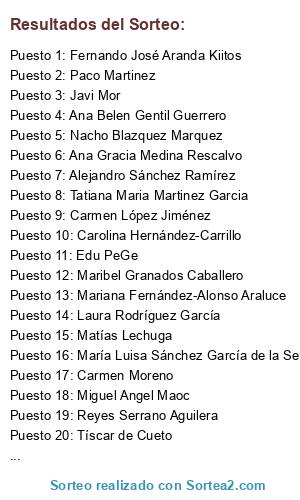 Lista de participantes: Carmen Paz, Celia Peña Martínez, Anita Soler, Sara Granados Cabeza, Jesus Caballero Brown, Cristina Navío, Rocío Muñoz Ros, Ana Fernandez Tirado, María Albertuz Crespo, Miri Amg, Rocio Garcia, Sky Cstls, Isabel AguiRo, Santii Paquet Hernández, Jorg LpRq, Pilar Maria, Pablo Cirre, Pablo Manresa, Claudio Gallardo, Fernando Prados Peis, Jesús Ltc, Jesus Fortes Aguilar, Laura Mariscal, Javi Roldán, Mv Nati, Laura ArbSan, Carmen Gomez Molina, Rocío Fajardo, Vanessa Lopez, Javier Árbol, Rafael Jesús Pérez Paiz, Jose Manuel Delgado Castillo, Isa Rommery, MT Alejandra, Reyes Serrano Aguilera, Alba Ruiz, Maribel Portellano Soriano, Mariana Fernández-Alonso Araluce, Patri Hilton, Alba Pantojo Vecino, El Jose, Alicia Luna Bravo, Maria Jesus Galera Redondo, Carmen Padial, C. D. T. F., Lolillo Wey, Ana Belen Gentil Guerrero, Laura Rodríguez García, Rocío Girela Martín, Alejandro Rosino, Isabel Balboa Mato, Antonio Toledo, Javier Quirosa Narváez, David Fernandez Sanchez, Elena Jiménez Picón, Fernando Rico, Manolo Membrilla Martínez, Cristina PerCas, Pablo Fernández Álvarez, Davinia Martin Fernandez, Pilar Medina, Maria Fernandez Garcia, Anabl MP, Ana Belen Rodriguez, Cristi Aparicio Olea, Sara Durán Martínez, John Meneses, Ivan Macias, Miriam Carroza, Jose Antonio Morante Gálvez, M Carmen Ramos, Irene Gador Morales Romero, Gloria Garví, Charo Pérez Córdoba, Celia CM, Victorio Guerrero Quesada, Sonia Ruiz, Wilma Salazar, Javi Mor, Maria Ruiz Barranco, Nieves Calero, Carmen Ruiz Marin, Rubén García, Emilio Frias Díaz, Miguel Chamorro, Blanca García Jiménez, Ana LG, Pablo Hidalgo Mañero, Migue Medina Soriano, Perro Loko, Isaac Romero Camacho, Raquel Jimenez Montes, Francisco Gómez Cantos, Anita Dooby Doo, María Ragarcia, Mercedes Martinez Galan, Anabel SC, Cami Medina Ruiz, Miguel Perea Lopez, Cristóbal Hinojosa, Alex Diaz, Alba HLo, Jose Romera Valentin, Inma Sj, Mati Rdrgz, Raquel Perez, Sergio Vilchez De Haro, Angela Martínez Gómez, Alicia Zamora, Adrián Hänsen, Elena Molina, Juan Mellado, Lucia La Negra, Cecilio T. Rodríguez, Carlos Guirao Martínez, Laura Romero Lozano, Francisco A. Suárez, Leire Poppins, Marta Gil, Flauta Canario, Karen OR, Montse Refoyo Bravo, Francisco Barrilado Fernandez, Ana Abril Montes, Rosana Jiménez, Maria Eugenia la Chica, Consuelo Caba Martín, Rosa María Fernández Ruiz, Isaac Domínguez Rojas, María Garrido, Alfonso Latorre, Antonio Hidalgo Gonzalez, Elvira Herrera, Miguel Angel Maoc, Patri Díaz Ríos, Mpaz F. Guerrero, Ana García García, Ana Rocio Alarcon Ayala, Mouxos Coruxas, Gema Anguís Morillas, Javier Unica Ruiz, Nieves Polo, Alberto Ruiz Rubio, Edu PeGe, Antonio Snchz Lpz, Bibi Pérez Garcés, Triniya Martin, Marta Montosa Rodriguez, Javi García Martínez, Jessica Fernández Higueras, Lor Troyano, Nuria Garcia, Pedro Moya Poza, Marya Gil Pérez, Ana Moreno, Jonathan Garcia Morales, Alejandro Espmar, Jaime Garzón Aguilar, Teresa López Fdez, Mari Paz Torres Nieto, Antonio Sánchez, JuanMa Cotelo, Amara Hamed Chaib, Teresa Torres Molina, Marina Salvador, Inma Molinero Ruiz, Carmen Díaz Vera, Jenny Vasquez, Puri Fernández, Cristina Caba, Merche Molero, Alicia Picossi, Vital Moles Defior, Fernando José Aranda Kiitos, Patricia Muros Rejón, Roger Fer San, Carmen López Jiménez, Luis Abogado, Anabel Bravo Pardo, Laura At Ma, Nuri Arco, Julia Sanchez Ruiz, Laura García, Laura Reyes García, Juan Castro, Fer Moreno Torres, Mamen Puga, Gloria Truz Wheatley, Cristy Vs, Daniel Jiménez Gutiérrez, Javi Freeman, Maria JR Jr., Marta Ruiz De La Fuente Serrano, Ana Ortega Rodriguez, Esmeralda Og, Luis Cuadrado Sáenz de Buruaga, Zaida Zai, Emiliano Guiote Moreno, Javier Romero, Manuel González Romero, Beli IS, Gloria Eme, Lou Rodríguez, Paco Delgado Fernandez, Alberto Fernández, Angel Castillo Pimentel, Javier Portillo Y Coello de Portugal, Sarah Clair Doyle, Elisa Recalde, Carlos M. Pérez, Jesus Rodriguez, Pg Manu, Viki Molina, Alejandro García Carretero, Tanya Grigorova, Ana Gracia Medina Rescalvo, Mayte Martínez Ruano, Tíscar de Cueto, Alberto Romero, Juan Carlos Liria Plazas, Tatiana Maria Martinez Garcia, Noemí Cambil Vázquez, Cruz Luna, Mari Carmen Garrido, Angel Jaldo Garcia, Helena Garvín López, Adriana Elvira, Angel Caro Alconchel, Diana Siniss Bathory, Noelia Sanchez, Rocío Cabir, Grazia del Churro, Isabel Morón Carrillo, María Olalla Luque Colmenero, Javier León Pérez, Rocio CR, Esther Chung, Álvaro Béiztegui Díaz, Bruno Lopez Hernandez, Nando García Iglesias, Evelyn Espínola Ramírez, Felix Garrido, Walter White, Anita Guiote, Patricia Sanjuán García, Carolina Hernández-Carrillo, Isabel Sierra Gener, María Fornieles Del Cid, Silvia Martin, Tania Espejo, Celia Rodriguez Lopez, Teresa Barrilado, Milagros Agros, Urru del Mar, Jose Luis Agudo, Ana Belén López Carpena, Juan MT, Jalfo DT, Miguel Angel Ortiz, Jaime López Castro, Patri Vc, Drew Luque, Fer Martinez, Alejandro Sánchez Ramírez, Regina Fernández Mirón, Leticia Perez Fernandez, Mariano Gm, Rocío Cejas Delgado, Patricia Amini, JuanMi Glez, Antonio López Galera, Joaquín Ruiz, Antonio L. TC, M Jose Martinez Moreno, Isra Romero Cañestro, Ana Morgado Garcia, Made Sánchez, Victor Miguel Alonso Sánchez, Gema Buendía, Ester Chicano Tejada, Ana YM, Javi Carrillo, Paco Martinez, Álvaro OMr, Matías Lechuga, Carmen Ruiz-Alba, Beatriz Maldonado Martinez, Nacho Blazquez Marquez, Noel Barral, Javi Pimentel de Maqua, Edurne Sánchez, Rocío Arroyo Morales, Sara Cañadas, Isa Rodríguez Tirado, Cristina BM, Frank Kujo, Carmen Moreno, Jennifer Rodriguez Morales, Antonio Millán S, Manuel Rodríguez Rodríguez, Seijas Enrique, Ana Serrano Aviles, Eva López Quirantes, Cristina Poulain, Iuly Dragoi, Vicky Burgos Marín, Eliana Gomez Vedia, María Luisa Sánchez García de la Serrana, Lydii Lydiis Blublublú, Carlos Peris Torres, Maribel Granados Caballero, Genoveva Molina, Carolina Morales, Elena Castillo Ruiz