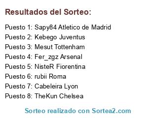 Lista de participantes: Kebego Juventus, NisteR Fiorentina, Sapy84 Atletico de Madrid, rubii Roma, Cabeleira Lyon, Mesut Tottenham, Fer_zgz Arsenal, TheKun Chelsea.