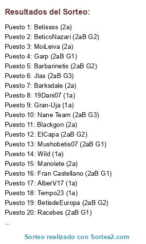 Lista de participantes: Barksdale (2a), Teskiyá (2a), JmJota (2aB G3), Fran Castellano (2aB G1), BeticoNazari (2aB G2), Alvaro FC (2aB G3), Betico_conquense (2aB G2), ElCapa (2aB G2), Garp (2aB G1), MoiLeiva (2a), Betissss (2a), Tempo23 (1a), OprincipeEdu (2aB G1), Racebes (2aB G1), Jlas (2aB G3), Manolete (2a), Pichichi_Molina (2a), Blackgon (2a), AlberV17 (1a), Muñoz.RBB (2aB G2), Vitillo (2a), BetisdeEuropa (2aB G2), German BubuBetis (1a), Barbarinetis (2aB G2), Piti (2aB G2), Pergañeta (2a), Nane Team (2aB G3), TK Betis (1a), Gran-Uja (1a), 19Dani07 (1a), Mushobetis07 (2aB G1), Wild (1a).
