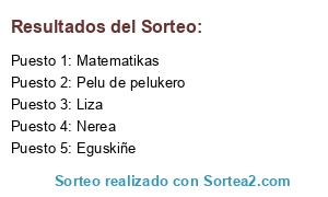Lista de participantes: Matematikas, Irati, Agirre, Nerea, Liza, Eguskiñe, Pelu de pelukero, Aritz erregea, Helene.