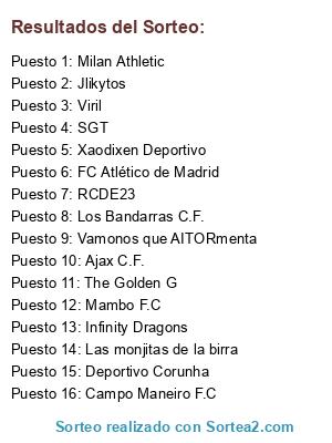 Lista de participantes: RCDE23, Los Bandarras C.F., FC Atlético de Madrid, Viril, Xaodixen Deportivo, Deportivo Corunha, Jlikytos, Mambo F.C, Milan Athletic, Vamonos que AITORmenta, Infinity Dragons, Las monjitas de la birra, SGT, Ajax C.F., Campo Maneiro F.C, The Golden G.