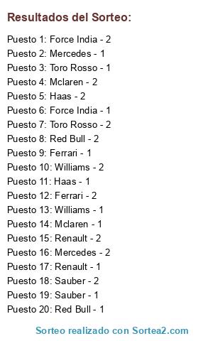Lista de participantes: Mercedes - 1, Mercedes - 2, Ferrari - 1, Ferrari - 2, Red Bull - 1, Red Bull - 2, Haas - 1, Haas - 2, Force India - 1, Force India - 2, Sauber - 1, Sauber - 2, Toro Rosso - 1, Toro Rosso - 2, Williams - 1, Williams - 2, Mclaren - 1, Mclaren - 2, Renault - 1, Renault - 2.
