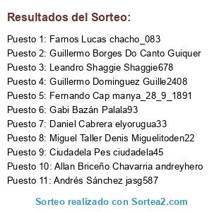 Lista de participantes: Farnos Lucas chacho_083, Daniel Cabrera elyorugua33, Guillermo Borges Do Canto Guiquer, Ciudadela Pes ciudadela45, Guillermo Dominguez Guille2408, Miguel Taller Denis Miguelitoden22, Allan Briceño Chavarria andreyhero, Andrés Sánchez jasg587, Fernando Cap manya_28_9_1891, Leandro Shaggie Shaggie678, Gabi Bazán Palala93.