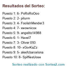 Lista de participantes: 1- Havel7, 2- piturm, 3- Oliver 093, 4- FoolishMender3, 5- alexfcbarcelona, 6- PoRoRoOoo, 7- xwownicox, 8- SpiffiestJose, 9- angelito14988, 10- xGorKaZz.