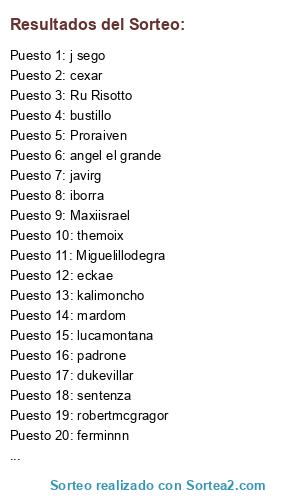 Lista de participantes: Oskarkawa, Luizao, ferminnn, eckae, padrone, sentenza, Miguelillodegra, robertmcgragor, kalimoncho, iborra, Ru Risotto, Proraiven, Sullendonkey, keops, Maxiisrael, Amonospare, ozora, angel el grande, j sego, mardom, osobla, javirg, rubencuervo, pepelu, cexar, lucamontana, beticopro, themoix, bustillo, mr rick, carmadayense, dukevillar.