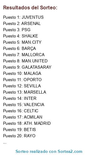 Lista de participantes: ACMILAN, VALENCIA, GALATASARAY, TOTTENHAM, MAN.UNITED, MALLORCA, ATH. MADRID, ARSENAL, OPORTO, BETIS, BARÇA, MINEIRO, JUVENTUS, MAN.CITY, MARSELLA, PSG, REAL MADRID, SHALKE, SEVILLA, CELTIC, INTER, PALERMO, MALAGA, LILLE, RAYO, BILBAO.
