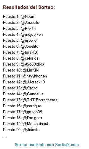 Lista de participantes: @paolo, @TNT Borracheras, @Pantic, @mojopikon, @Sacro, @bart026, @Piol1n, @celorios, @JJcrack10, @Ayo83xbox, @rayykkonen, @Jusedilo, @carrique, @LinKiN, @gabito09, @Jordycf, @xtian33, @erpollo, @Jaimito, @Joselito, @Candelus, @Malaguista4, @IsraRS, @Noan, @Droigner.