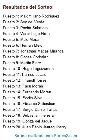 Lista de participantes: Imanoll Torres, Hernan Melo, Jonathan Matias Miranda, Farnos Lucas, Maximiliano Rodriguez, Facu Moran, Fernando Moran, Martin Fiore, Maxi Moran, Sergio Daniel Farias, Victor hugo Flores, Pocho Sabalero, Ezzito Silva, Gonza del Jaguel, Hugo Leguizamon, Sebastian Herrera, Ebuarbo Sebastian, Gonza Corbalan, Soy del Verde, Juan Pablo Jaureguiberry.