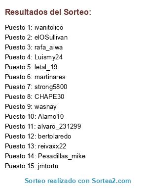 Lista de participantes: Luismy24, jmtortu, ivanitolico, alvaro_231299, bertolaredo, strong5800, martinares, rafa_aiwa, letal_19, reivaxx22, wasnay, elOSullivan, CHAPE30, Pesadillas_mike, Alamo10.