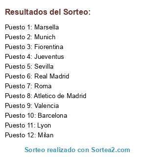 Lista de participantes: Real Madrid, Barcelona, Valencia, Sevilla, Atletico de Madrid, Roma, Milan, Fiorentina, Jueventus, Munich, Marsella, Lyon.