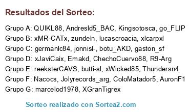 Lista de participantes: XGranTigrex, Nacocs, ColoMatador5, Andresld5_BAC, xJaviCaix, R9-Arg, ChechoCuervo88, gaston_sf, Kingsotosca, marcelod1978, go_FLIP, reeksterCAVS, lucascroacia, xWicked85, Emakd, Thundersn4, zundeln, jonnisl-, germanlc84, butti-sl, QUIKL88, xlcarpxl, Jolyrecords_arg, botu_AKD, AuronF1, xMR-CATx.