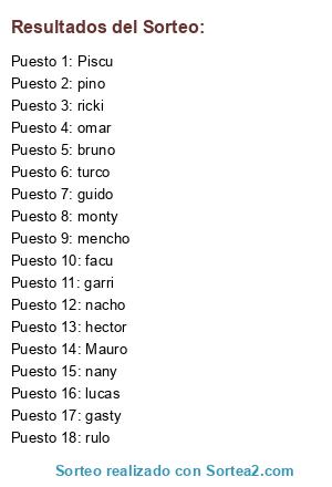 Lista de participantes: nany, turco, ricki, rulo, monty, pino, gasty, facu, nacho, mencho, omar, guido, bruno, hector, garri, lucas, Mauro, Piscu.