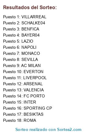 Lista de participantes: ARSENAL, BAYER04, EVERTON, SCHALKE04, VILLARREAL, SPORTING CP, LAZIO, LIVERPOOL, SEVILLA, AC MILAN, VALENCIA, BESIKTAS, MONACO, BENFICA, NAPOLI, FC PORTO, ROMA, INTER.