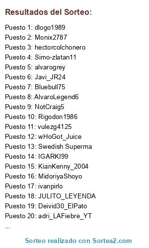 Lista de participantes: adri_LAFiebre_YT, Deivid30_ElPato, hectorcolchonero, Monix2787, JULITO_LEYENDA, mdmbskn13, IGARKI99, Javi_JR24, AlvaroLegend6, wHoGot_Juice, diegoheisenberg, Rigodon1986, alvarogrey, Simo-zlatan11, jereN2468, ivanpirlo, Bluebull75, Charly_DG23, Swedish Superma, Marralandiatwich, MidoriyaShoyo, MatteoShoOteRZ57, KianKenny_2004, NotCraig5, El_Maraz_BSE, dlogo1989, vulezg4125.