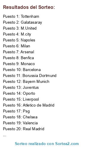 Lista de participantes: Napoles, Psg, M.city, Tottenham, Chelsea, Real Madrid, Milan, Borussia Dortmund, Schalke 04, Roma, Valencia, Zenit, Monaco, Bayern Munich, Atletico de Madrid, Barcelona, Benfica, Galatasaray, Oporto, Inter de milan, Juventus, M.United, Arsenal, Liverpool.