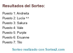 Lista de participantes: Sakura, Vale , Purple, Andreita, Eruanne, Lucía ^^, Tilo.