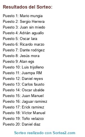 Lista de participantes: Daniel reyes, Víctor Manuel, Jesús mora, Erick ramirez, Juan Manuel, Oscar ubalde, Jaguar ramirez, Alan egs, Dante rodrigez, Oscar lara, Toño velazco, Carlos fausto, Ricardo marzo, Daniel diaz, Mario mungia, Adrián aguallo, Juampa RM, Sergio Herrera, Juan sin miedo, Luis trijolleno.