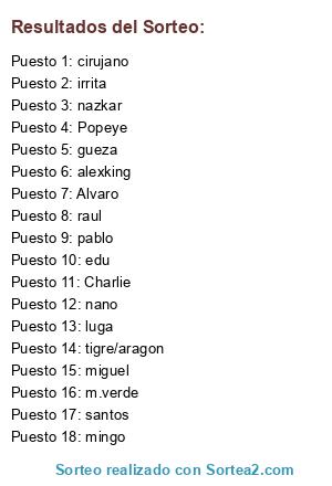 Lista de participantes: Angel, Eldanorte, Tito, Denis, Canita, Romario, Alvaro, Kefer, Xavier, Cirujano, Tigre, Panaca, Fabio, Nazkar, Santos, Charlie, Raks, Edu, FranRuiz, Tiparraco.