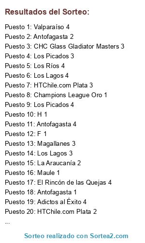 Lista de participantes: Valparaíso 1, Valparaíso 2, Valparaíso 3, Valparaíso 4, Los Ríos 1, Los Ríos 2, Los Ríos 3, Los Ríos 4, Arica y Parinacota 1, Arica y Parinacota 2, Arica y Parinacota 3, Arica y Parinacota 4, Antofagasta 1, Antofagasta 2, Antofagasta 3, Antofagasta 4, Bío-Bío 1, Bío-Bío 2, Bío-Bío 3, Bío-Bío 4, Magallanes 1, Magallanes 2, Magallanes 3, Magallanes 4, Metropolitana 1, Metropolitana 2, Metropolitana 3, Metropolitana 4, La Araucanía 1, La Araucanía 2, La Araucanía 3, La Araucanía 4, Los Lagos 1, Los Lagos 2, Los Lagos 3, Los Lagos 4, Tarapacá 1, Tarapacá 2, Coquimbo 1, Coquimbo 2, Maule 1, Maule 2, O'Higgins 1, O'Higgins 2, Atacama 1, Aysén 1, Adictos al Éxito 1, Adictos al Éxito 2, Adictos al Éxito 3, Adictos al Éxito 4, Nos Fuimos a la Primera 1, Nos Fuimos a la Primera 2, Colocolinos 1, Colocolinos 2, Colocolinos 3, Colocolinos 4, El Rincón de las Quejas 1, El Rincón de las Quejas 2, El Rincón de las Quejas 3, El Rincón de las Quejas 4, CHC Glass Gladiator Masters 1, CHC Glass Gladiator Masters 2, CHC Glass Gladiator Masters 3, CHC Glass Gladiator Masters 4, Champions League Oro 1, Champions League Oro 2, Champions League Oro 3, Champions League Oro 4, Cheerios 1, Cheerios 2, Cheerios 3, Cheerios 4, Dalebulla 1, Dalebulla 2, Dalebulla 3, Dalebulla 4, Los Picados 1, Los Picados 2, Los Picados 3, Los Picados 4, HTChile.com Oro 1, HTChile.com Oro 2, HTChile.com Plata 1, HTChile.com Plata 2, HTChile.com Plata 3, HTChile.com Plata 4, Portalnet 1, Campeón CDF Anterior, Subcampeón CDF Anterior, A 1, B 1, C 1, D 1, E 1, F 1, G 1, H 1, I 1, J 1.