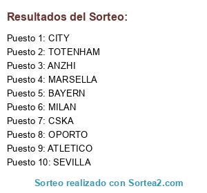 Lista de participantes: ATLETICO, SEVILLA, MARSELLA, ANZHI, TOTENHAM, OPORTO, MILAN, CITY, BAYERN, CSKA.