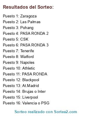 Lista de participantes: Pohang, Tenerife, At.Madrid, Blackpool, Liverpool, PASA RONDA, Brujas o Inter, Napoles, CSK, Zaragoza, Valencia o PSG, Athletic, Las Palmas, PASA RONDA 2, Watford, PASA RONDA 3.