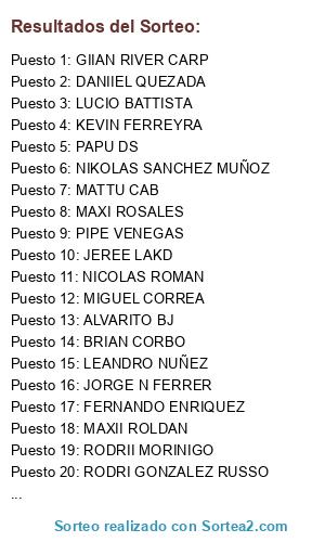 Lista de participantes: NICOLAS ROMAN, FAKU BARLA NEGRI AZUL, MAXII ROLDAN, MAXI ROSALES, PIPE VENEGAS, NIKOLAS SANCHEZ MUÑOZ, MATTU CAB, FERNANDO ENRIQUEZ, DANIIEL QUEZADA, KEVIN FERREYRA, MIGUEL CORREA, LUCIO BATTISTA, PAPU DS, JEREE LAKD, LEANDRO NUÑEZ, RODRI GONZALEZ RUSSO, RODRII MORINIGO, ALVARITO BJ, GIIAN RIVER CARP, JORGE N FERRER, BRIAN CORBO, LAUTARO ELIZONDO.