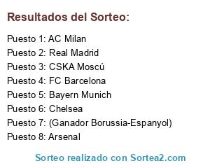 Lista de participantes: Chelsea, (Ganador Borussia-Espanyol), CSKA Moscú, Bayern Munich, AC Milan, FC Barcelona, Real Madrid, Arsenal.