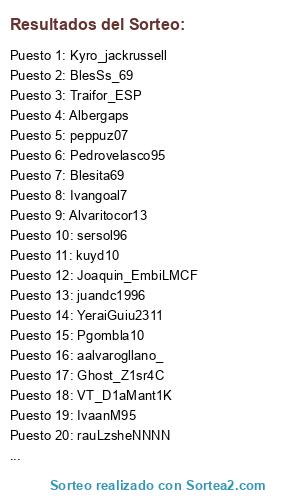 Lista de participantes: VT_Energetik, peppuz07, Traifor_ESP, Blesita69, YeraiGuiu2311, rauLzsheNNNN, sersol96, Tanito226, Kyro_jackrussell, Joaquin_EmbiLMCF, BlesSs_69, Alvaritocor13, kuyd10, Albergaps, Pgombla10, Ivangoal7, aalvarogllano_, Pedrovelasco95, Ghost_Z1sr4C, Palomotitular, dmunoz01, juandc1996, VT_D1aMant1K, IvaanM95.