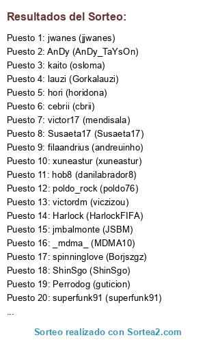 Lista de participantes: Rikirt_SG (Rikirt), lauzi (Gorkalauzi), filaandrius (andreuinho), _mdma_ (MDMA10), victor17 (mendisala), kaito (osloma), Kema (miguelanyez), cebrii (cbrii), HrC (HrC1989), jmbalmonte (JSBM), jwanes (jjwanes), AnDy (AnDy_TaYsOn), hori (horidona), spinninglove (Borjszgz), xuneastur (xuneastur), Harlock (HarlockFIFA), Susaeta17 (Susaeta17), hob8 (danilabrador8), koblas (koblas73), ShinSgo (ShinSgo), Perrodog (guticion), victordm (viczizou), poldo_rock (poldo76), superfunk91 (superfunk91).