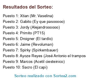 Lista de participantes: Primito (PT15), Jordy (Alejandroooooo), Marcos (Acetil ciesteinico), Gabito (Ey que pasooooo), Sacro (El capi), Spirky (Spirkembauer), Jaime (Revoluman), Droigner (El tardío), Xtian (Mr. Vaselina), Ayoze Reyes (José Antonio el tramposo).