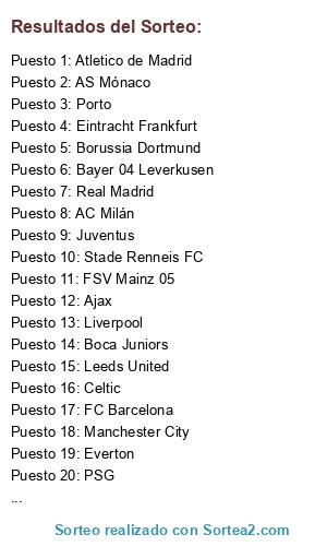 Lista de participantes: AC Milán, Ajax, AS Mónaco, Atletico de Madrid, Bayer 04 Leverkusen, Boca Juniors, Borussia Dortmund, Celtic, Eintracht Frankfurt, Everton, FC Barcelona, FC Bayern Munich, FSV Mainz 05, Juventus, Leeds United, Liverpool, Manchester City, Manchester United, Porto, PSG, Real Madrid, Stade Renneis FC, Tottenham.