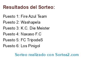 Lista de participantes: FC TripodeS, Naxaso F.C, Washapela, K.C. Die Meister, Los Pinigol, Fire Azul Team.