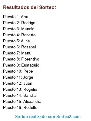 Lista de participantes: Jorge, Juan, Rodrigo, Rosabel, Pepe, Manu, Manolo, Roberto, Rodolfo, Rogelio, Eustaquio, Florentino, Alexandra, Sandra, Ana, Alina.