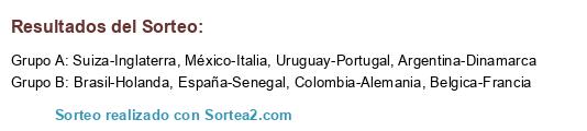 Lista de participantes: España-Senegal, Uruguay-Portugal, Suiza-Inglaterra, Belgica-Francia, Brasil-Holanda, Colombia-Alemania, Argentina-Dinamarca, México-Italia.
