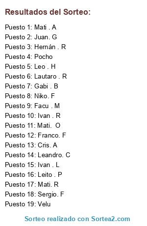 Lista de participantes: Sergio. F, Juan. G, Velu, Cris. A, Facu . M, Franco. F, Gabi . B, Hernán . R, Ivan . R, Ivan . L, Lautaro . R, Leandro. C, Leito . P, Leo . H, Mati . A, Mati. O, Mati. R, Niko. F, Pocho.