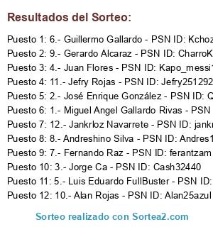 Lista de participantes: 1.- Miguel Angel Gallardo Rivas - PSN ID: FZ-Latin, 2.- José Enrique González - PSN ID: Quezoz11, 3.- Jorge Ca - PSN ID: Cash32440, 4.- Juan Flores - PSN ID: Kapo_messi10, 5.- Luis Eduardo FullBuster - PSN ID: Pyreckz, 6.- Guillermo Gallardo - PSN ID: Kchoz95, 7.- Fernando Raz - PSN ID: ferantzam, 8.- Andreshino Silva - PSN ID: Andres11silvaj, 9.- Gerardo Alcaraz - PSN ID: CharroKiller_, 10.- Alan Rojas - PSN ID: Alan25azul, 11.- Jefry Rojas - PSN ID: Jefry251292, 12.- Jankrloz Navarrete - PSN ID: jankrloz.