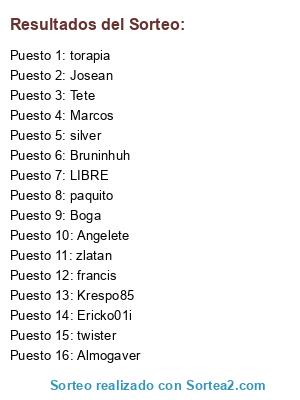 Lista de participantes: Tete, Bruninhuh, Almogaver, Ericko01i, Boga, torapia, Marcos, Angelete, Krespo85, paquito, francis, zlatan, silver, twister, Josean, LIBRE.