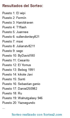 Lista de participantes: sullendonkey821, Cesarito, Fermín, nieto, betico, Santi, Juannee, El Yomus, maxi, T1flash, Sebastian genio, Yazsegundo, kikote Javi, Haroldraven, sego, Ru, Daniel250982, Walnutgalaxy 946, Pedalmambo73, ByDavid180, Snackerthan, Bebog 1991, Julianstv8211, El wipi.