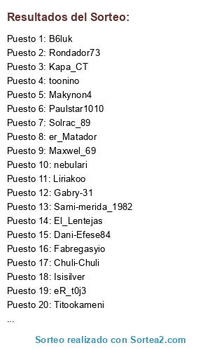 Lista de participantes: toonino, ganso15, eR_t0j3, Liriakoo, Sami-merida_1982, Bori_Extreme, El_Lentejas, Solrac_89, Maxwel_69, Paulstar1010, Rondador73, Martinares, Montxoli, er_Matador, Fabregasyio, Gabry-31, Titookameni, B6luk, Kapa_CT, Chuli-Chuli, Makynon4, nebulari, Isisilver, Dani-Efese84.