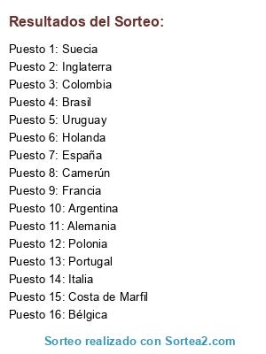 Lista de participantes: España, Brasil, Alemania, Argentina, Italia, Francia, Portugal, Inglaterra, Holanda, Bélgica, Uruguay, Colombia, Suecia, Polonia, Costa de Marfil, Camerún.
