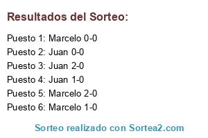 Lista de participantes: Juan 2-0, Marcelo 2-0, Juan 1-0, Marcelo 1-0, Juan 0-0, Marcelo 0-0.