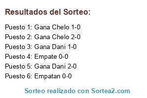 Lista de participantes: Gana Chelo en los 90', Gana Dani en los 90', Gana Chelo en prorroga, Gana Dani en prorroga, Gana Chelo x penales, Gana Dani x penales.
